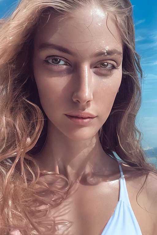 Professional full body shot of a young european woman wearing only a white two-piece swimsuit (beach) , (dune) , long hair, perfect female anatomy, beautiful detailed face, beautiful symmetrical face, beautiful natural makeup, photorealistic, hyperrealistic, realistic, extremely detailed, sharp focus, cinematic light, rays of the gods, (pink sunset) , intense sunset, film grain, professional color grading, digital art, very detailed, depth of field, f/1. 4, 50mm, 8k