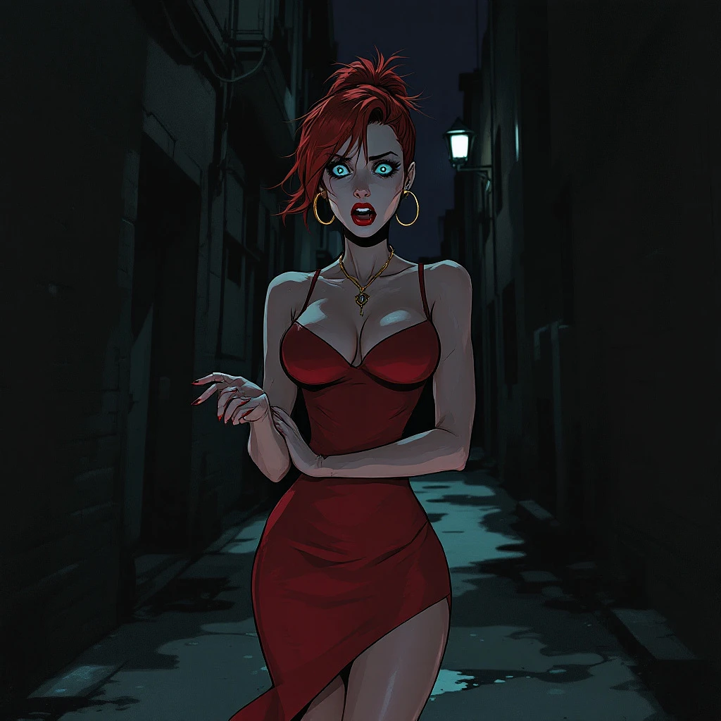 anime, woman, red hair, short ponytail, cyan eyes, red lips, red bodycon dress, tight dress, red high heels, golden hoop earrings, bare legs, closed cleavage, massive chest, bare arms, with straps, arms crossed, walking in a dark alleyway, scared expression