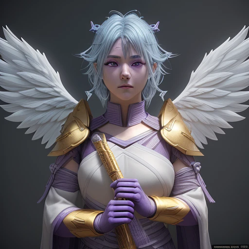 angelic warrior::4 hyper-realistic ::5 detailed character expressions :: 3 Ultra-detailed Quality 3D Octane Render :: volumetric lighting :: --ar 9:16 --quality 2 --s 750 --niji 5, with blue hair Saffron - yellow skin and amethyt - purple eyes, , 32K, winning studio photography, profesional color grading, soft shadow, no contrast, clea sharp focus, film photography