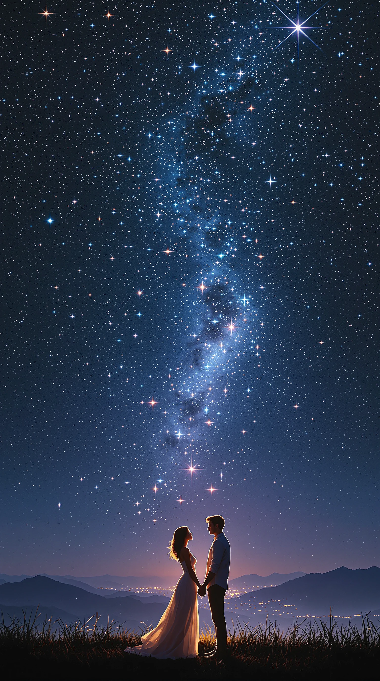 A breathtaking night scene where two lovers stand beneath an endless expanse of glowing celestial lights. The sky is alive with countless shimmering stars, some appearing to streak across the heavens as if on the verge of falling.