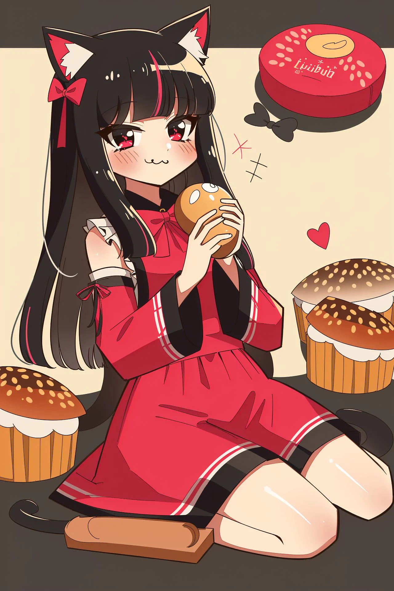 by tukumi bis, 1girl, food, chibi, animal ears, red eyes, black hair, solo, wagashi, bow, hair bow, food on face, cat ears, detached sleeves, holding, holding food, multicolored hair, heart, long hair, eating, dress, red dress, sitting, blush, :3, looking at viewer, dango, bangs, cat girl, animal ear fluff