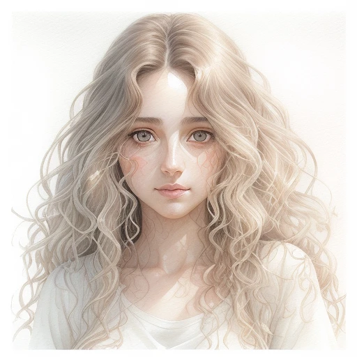light natural tones , pencil drawing , watercolor drawing, portrait of a woman with long curly hair and white shirt, detailed eyes, beautiful , highly detailed, soft color tones, soft lighting, detailed lines, sharp, realistic, brush strokes, light hints of paint drips