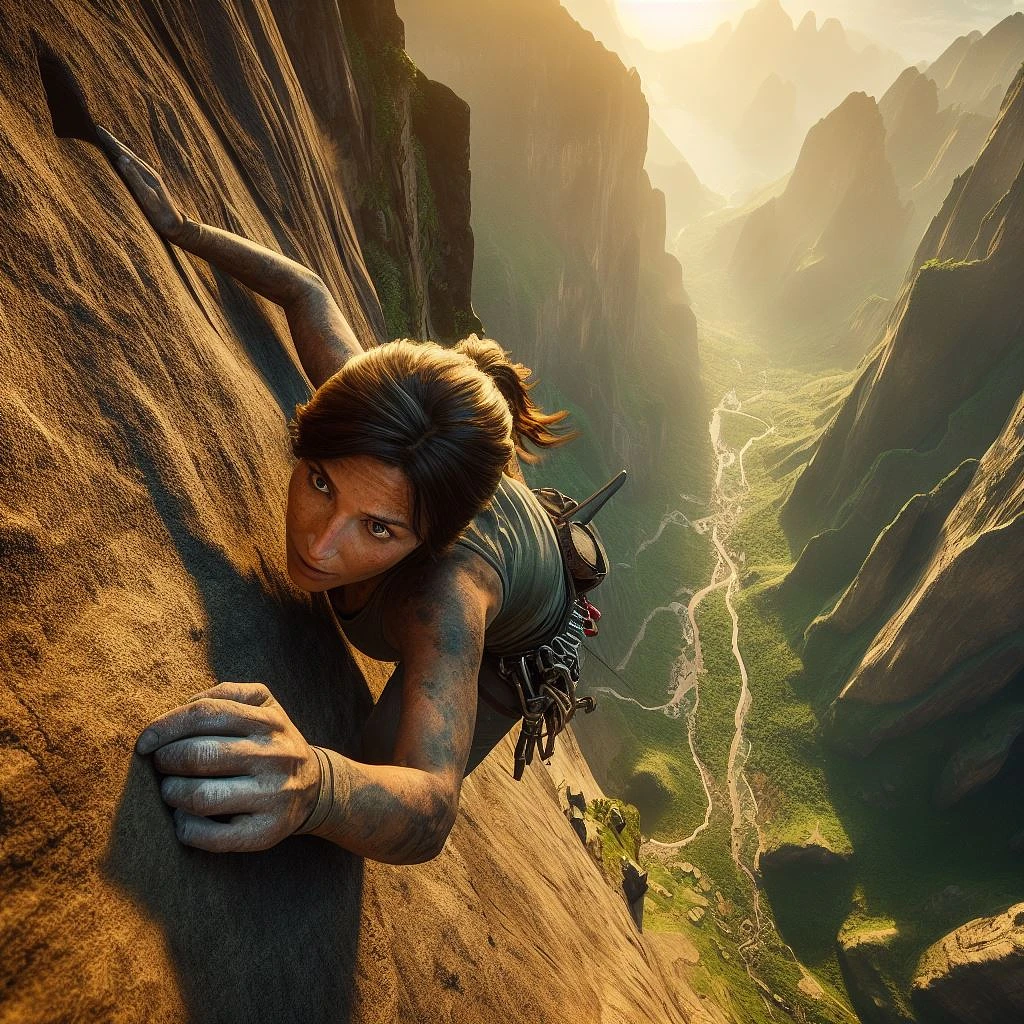 top down photo of Lara Croft scaling a mountain rock face freeclimbing over a beautiful valley facing camera, photorealistic, cinematic, golden hour