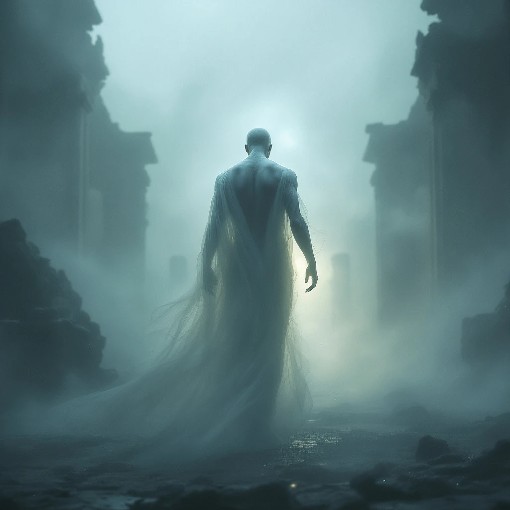A fine art, hyper-realistic, cinematic image of a man with their back to me standing gracefully amidst swirling, ghostly mist. Their form is ethereal and translucent, fading into the mist that surrounds him, his body partially visible but soft and hazy, as though she is only barely present in this world. The volumetric light gently illuminates his from behind, casting soft, delicate shadows across his figure and adding depth to the mist that seems to both surround and blend into him. His skin, though pale and almost transparent, reflects a subtle, ghostly glow, as though she is illuminated from within. The mist swirls around her, caressing his body, obscuring parts of her figure while leaving other parts faintly visible otherworldly feeling. The setting is a dreamlike, misty void, with only faint hints of an ancient, forgotten world in the distance. Barely visible ruins or broken columns appear as faint silhouettes in the fog, giving a sense of history and mystery to the scene. The ground beneath him is indistinct, as though the mist itself is the floor, with floating particles glinting softly in the ethereal light. The lighting is soft and diffused, with beams of light cutting through the mist, creating a sense of depth and atmosphere. The man's form is highlighted by this light, her figure partially illuminated while the rest fades into the mist, emphasizing his delicate, ghostly presence. The entire composition is rendered in fine art, photorealistic detail, with a soft film grain adding texture and a timeless quality to the image. Key Elements with Weights: (Fine art, hyper-realistic, cinematic lighting:1.5) (Volumetric light, swirling mist:1.5) (Ghostly form fading into the mist:1.5) (Floating particles, soft glow:1.3) (Film grain, photorealistic textures:1.3) (Dreamlike, mystical atmosphere:1.5)