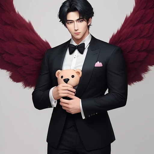 A very handsome anime-mesmerizing male teddy bear that's holding a heart with a very suave outfit and he has beautiful, stunning, mesmerizing large wings
