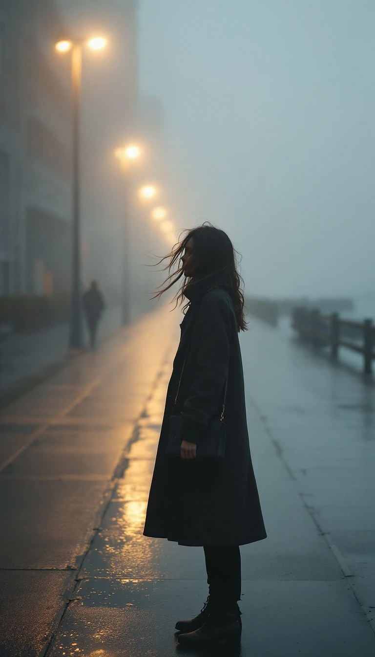 girl standing on a foggy pavement while holding her purse, in the style of yigal ozeri, video, beach portraits, kaethe butcher, close up, michael malm, soft hues --ar 36:55 --stylize 750 --v 6