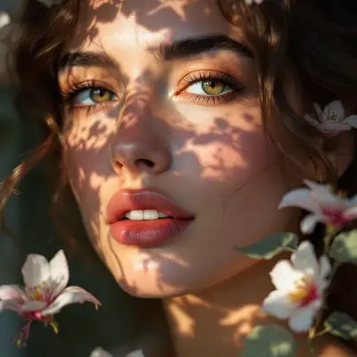 In a hyperrealistic style, a European woman’s portrait showcases stunning details, floral shadows gracefully dancing across her visage, a soft gradient of colors enhancing the tranquil mood.