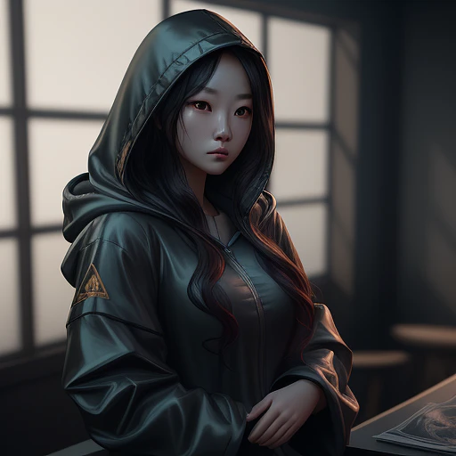 Photo of a pretty young Chinese lady wearing an oversized hooded jacket with long wavy hair, indoor, studio shot, dramatic lighting, concept art, unreal engine 5, RTX, ray tracing, photorealistic