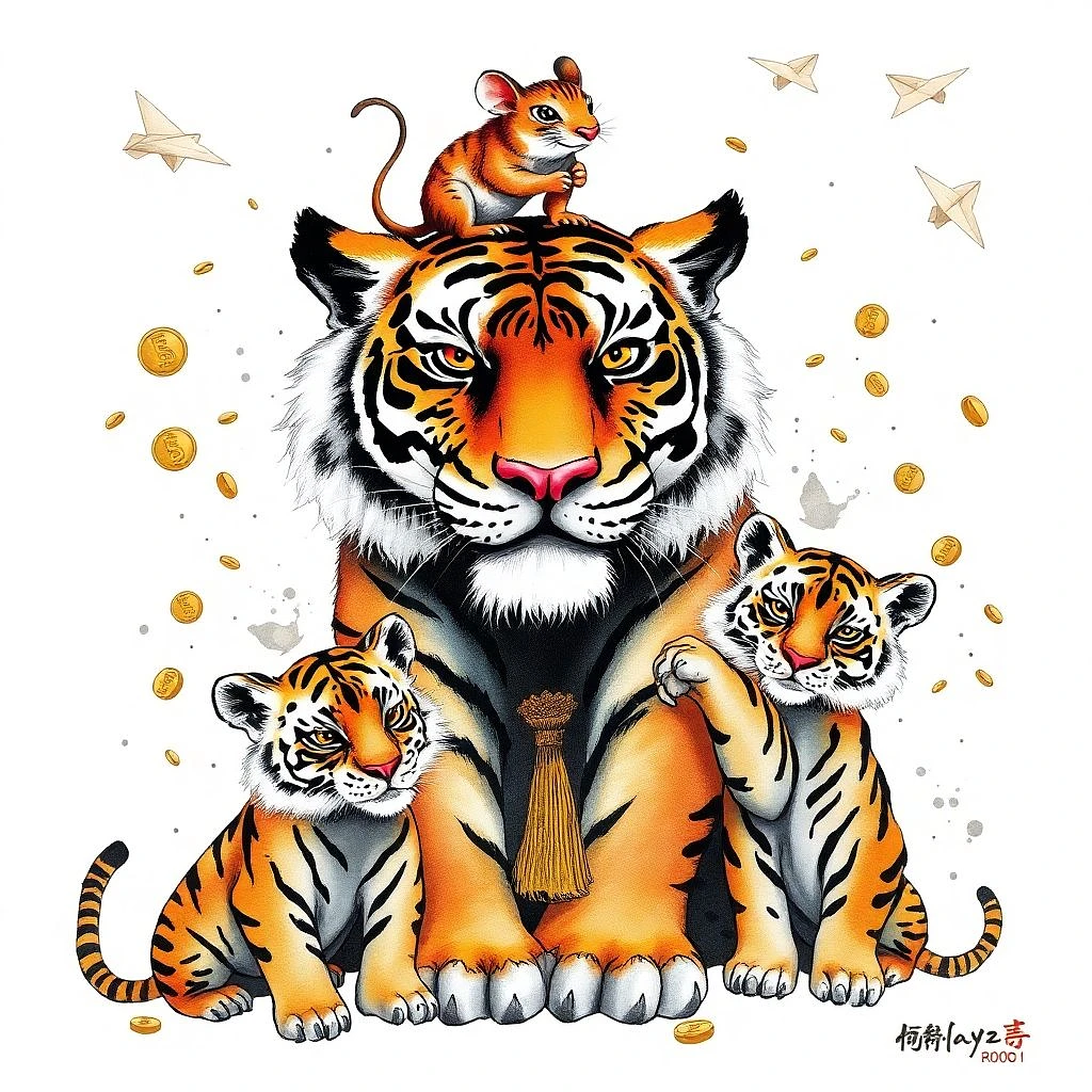 A big tiger and two little tigers, with a mouse on the big tiger's head, the mouse holding a talisman, the tiger holding a money bag, scattered copper coins and gold beans in the background, paper airplanes in the background, ink splashes above, rich in details, the tiger is the main subject, ink swirling around its body, in an ink wash style,masterpiece, best quality, original, wallpaper, colorful, covr, everyone, gradient_background, huge_filesize, highres, traditional_media, fine_art_parody, head tilt, ink style,watercolor_ (medium) ,