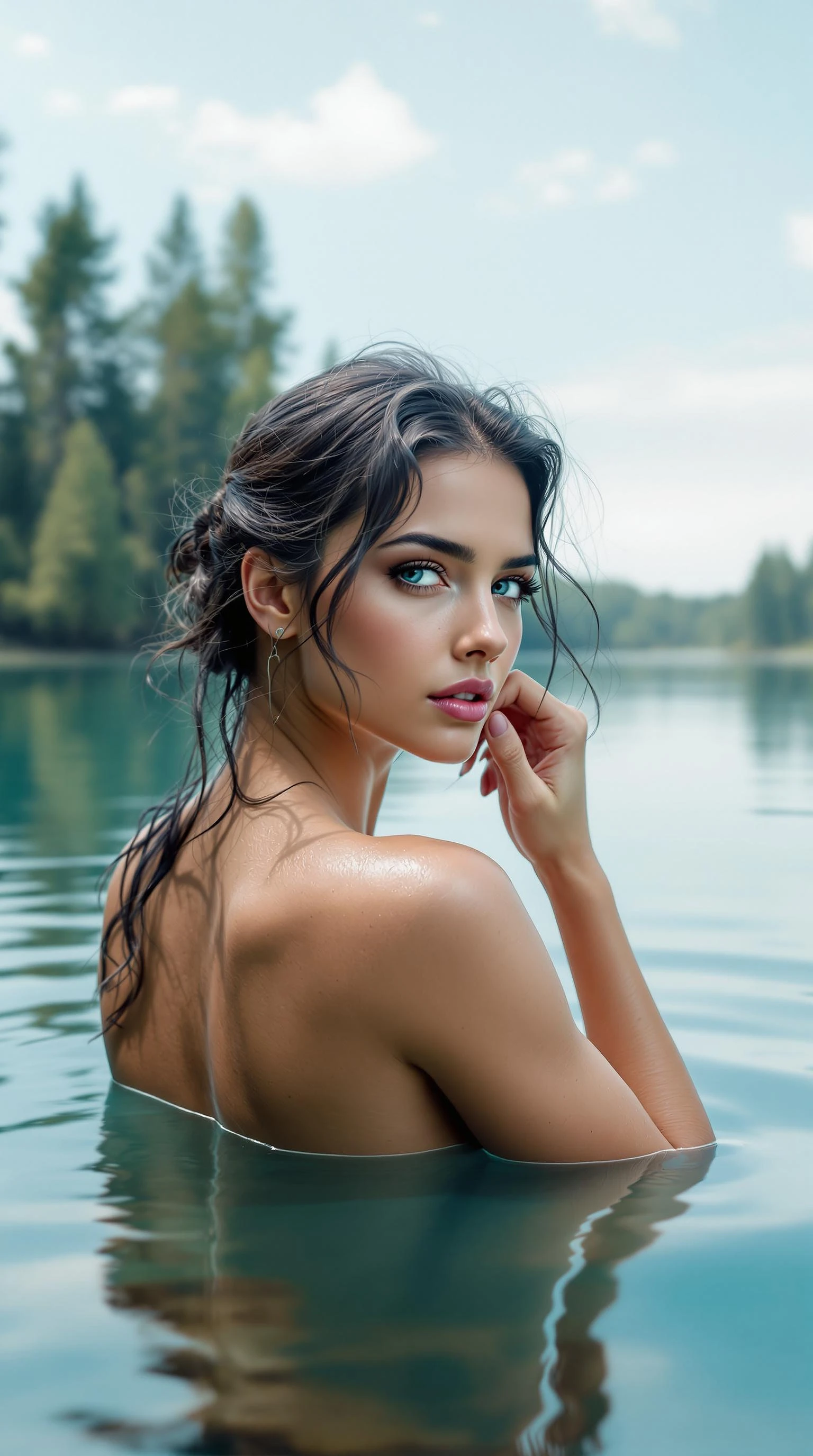 A woman stands in a serene lake, her back to the viewer, looking over her shoulder with light blue eyes that shimmer with allure. Her hand gently touches her face, conveying a mix of vulnerability and confidence. The clear sky reflects the calm water, creating a tranquil, almost ethereal atmosphere. The scene is bathed in soft, diffused sunlight, casting a gentle glow on her skin. The background is a lush, natural landscape with tall trees framing the lake, enhancing the sense of isolation and intimacy.