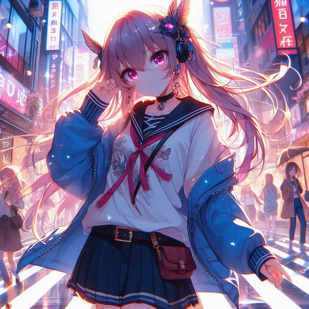 anime by Studio Trigger style, 2D, illustration, beautiful, kawaii bishoujo fashion model, street scene, epic, acid trip, low camera angle, photography, light from front, intricate details, highly detailed, insanely detailed, 8K, hd, sharp focus --ar 2:3 --v 5