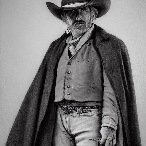 High resolution photography of a ultra realistican old cowboy in 19th century, beautiful painting with highly detailed face by tim cox, with a wide cowboy hat, which gives him a mysterious and so gloomy, he wears a long cape and poncho , which gives him an air of a lonely and carefree protagonist, Beneath the cloak he wears a white shirt and a dark brown vest, which is often covered in dust and worn due to the arid conditions of the environment, he also wears a wide belt and a pair of revolvers crossed at the waist, highlighting his role as a bounty hunter and his skill with weapons, His calm and confident demeanor, combined with his scruffy yet elegant appearance, creates an iconic and recognizable cowboy