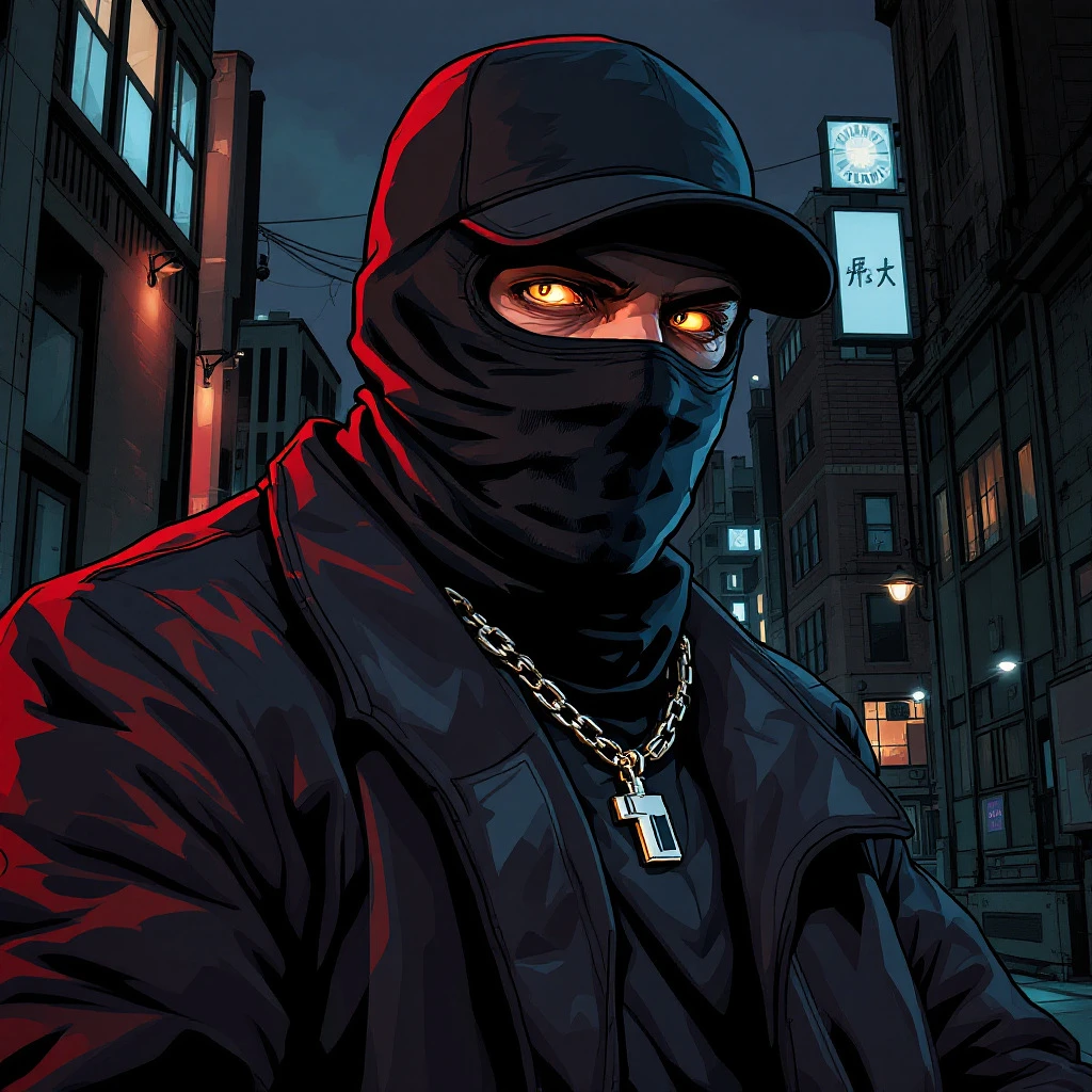 Cartoon illustration of a man in a black mask with a chain around his neck holding a gun, gta chinatown art style, gta art style, gta 5 comics art, gta chinatown wars art style, gta cover 2d game art, gta cover 2d game art, gta iv art style, rotoscoping, gta art style, gta v artwork style, gangsta rap