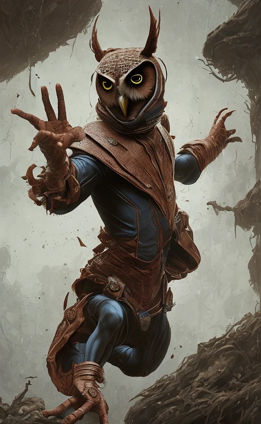 An owl man dressed in a 19th century costume spiderman, smiled, symmetrical facial features, front game card, Drark, Marvel Comics, very pretty, feeling calm, intricate, highly detailed, soft, Artstation, digital illustration by Ruan Jia and Mandy Jurgens and Artgerm and Wayne Barlowe and Greg Rutkowski and Zdislav Beksinski