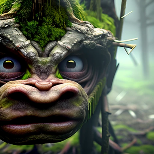 a harrowing bog troll gazing into the camera with sad glassy eyes, up close, nanite rendering, 32k, volumetric lighting, hyper realistic