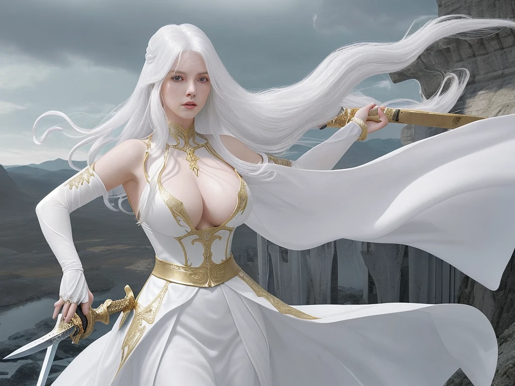 a woman in a white dress holding a sword, with a fantasy landscape in the background. The woman has long, flowing white hair, a large bosom and is wearing a white dress with gold accents and a plunging neckline. She is holding a large sword in her right hand, with the blade pointing downwards. The sword has a gold hilt and a long, curved blade. The woman is standing in a dramatic pose, with her left hand on her hip and her right hand holding the sword. The background of the image is a fantasy landscape, with tall spires and towers rising up into the sky. The sky is dark and cloudy, with a few stars visible. The overall effect of the image is one of drama and fantasy, with the woman in the white dress and the sword being the central focus of the image.