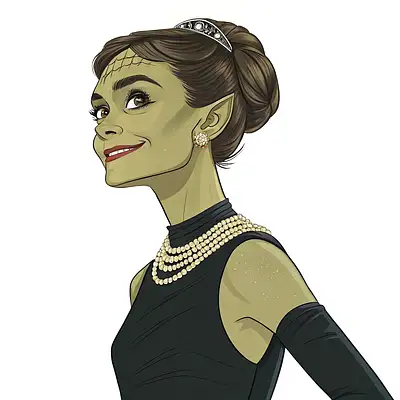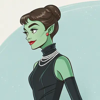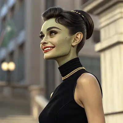 Modeled after Audrey Hepburn from breakfast at tiffany's. Olive skin female alien human hybrid with slight reptilian features. Dressed in a catsuit like a Bond girl from James Bond.