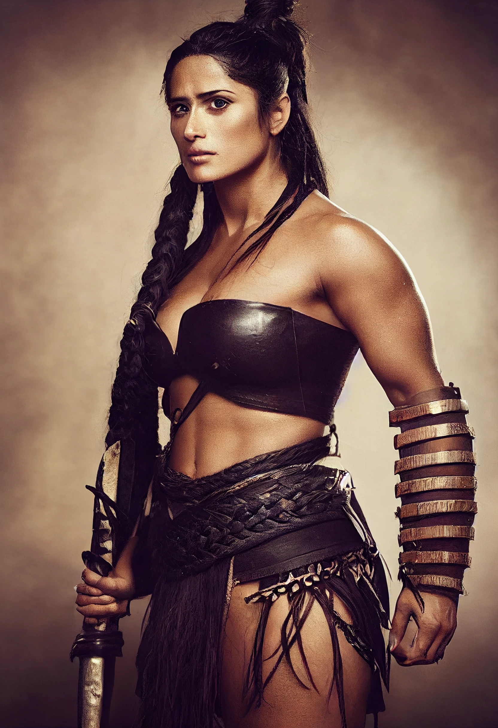 First person full body color photograph of a dark skined female barbarian warrior with braided black hair and with the beautiful face of Salma Hayek, fit and muscular, chainmail loincloth :: 8k, photograph, portrait, medium shot, 100mm lens, f/2. 8, symmetrical face, accurate skin detail :: volumetric lighting, dark dramatic atmosphere, rule of thirds, unreal engine 5 render --ar 1:2 --testp --chaos 23 --upbeta