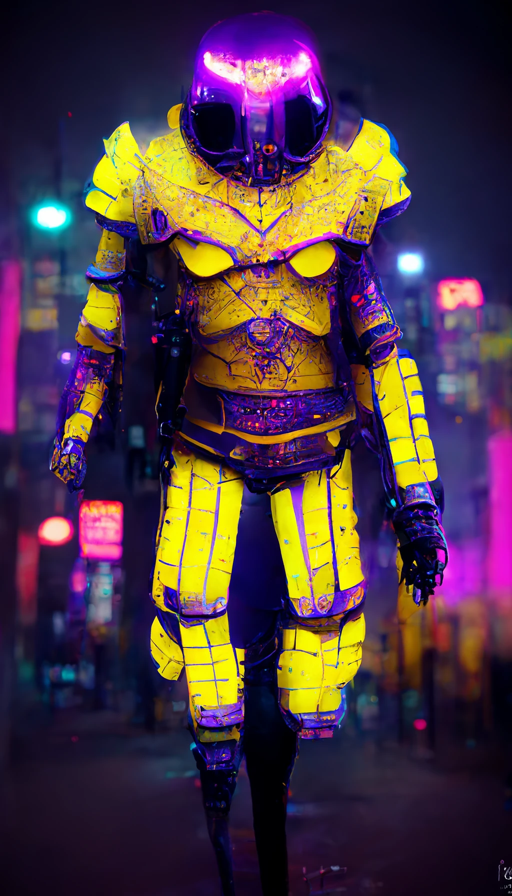 a yellow cyperpunk full body knight made of detailed corn seeds yellow glowing armor, walking in a neon purple lights synthwave style cyberpunk city, synthwave style, detailed-background, photo-realistic, unreal engine 5 render, --ar 9:16