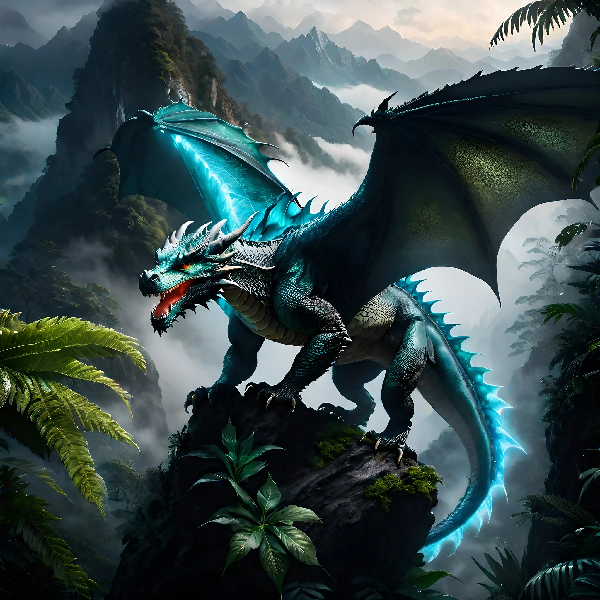 sharp focus, studio photo, highly detailed, extremely detailed, natural photo of a dragon climbing up a mountainside, bioluminescence, intricate details, pearlescent, misty, foggy rainforest in background, beautiful scales, beautiful eyes, realistic, hyperrealistic, two wings, correct and natural lighting, anatomically correct dragon