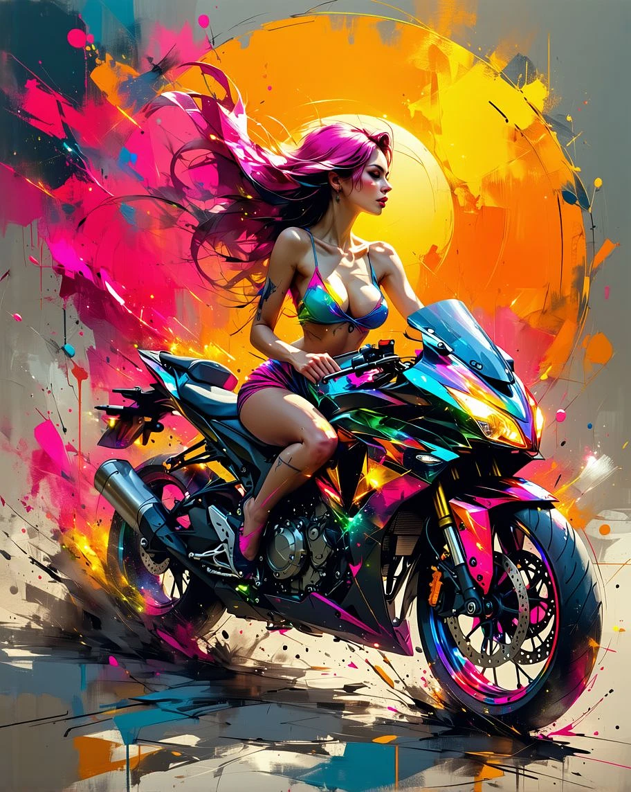 Uma mulher estilizada e bela, com traços elegantes e cabelos fluindo ao vento, transformada em uma motocicleta vibrante e cheia de vida. A moto-mulher combina formas femininas suaves com o design dinâmico de uma moto esportiva, pintada com cores vibrantes como vermelho intenso, azul elétrico e amarelo neon, contrastando com detalhes metálicos brilhantes. O fundo é um céu ao pôr do sol, com tons quentes de laranja, rosa e roxo, criando uma sensação de movimento, liberdade e energia. "in the style of Pulp art --v 6