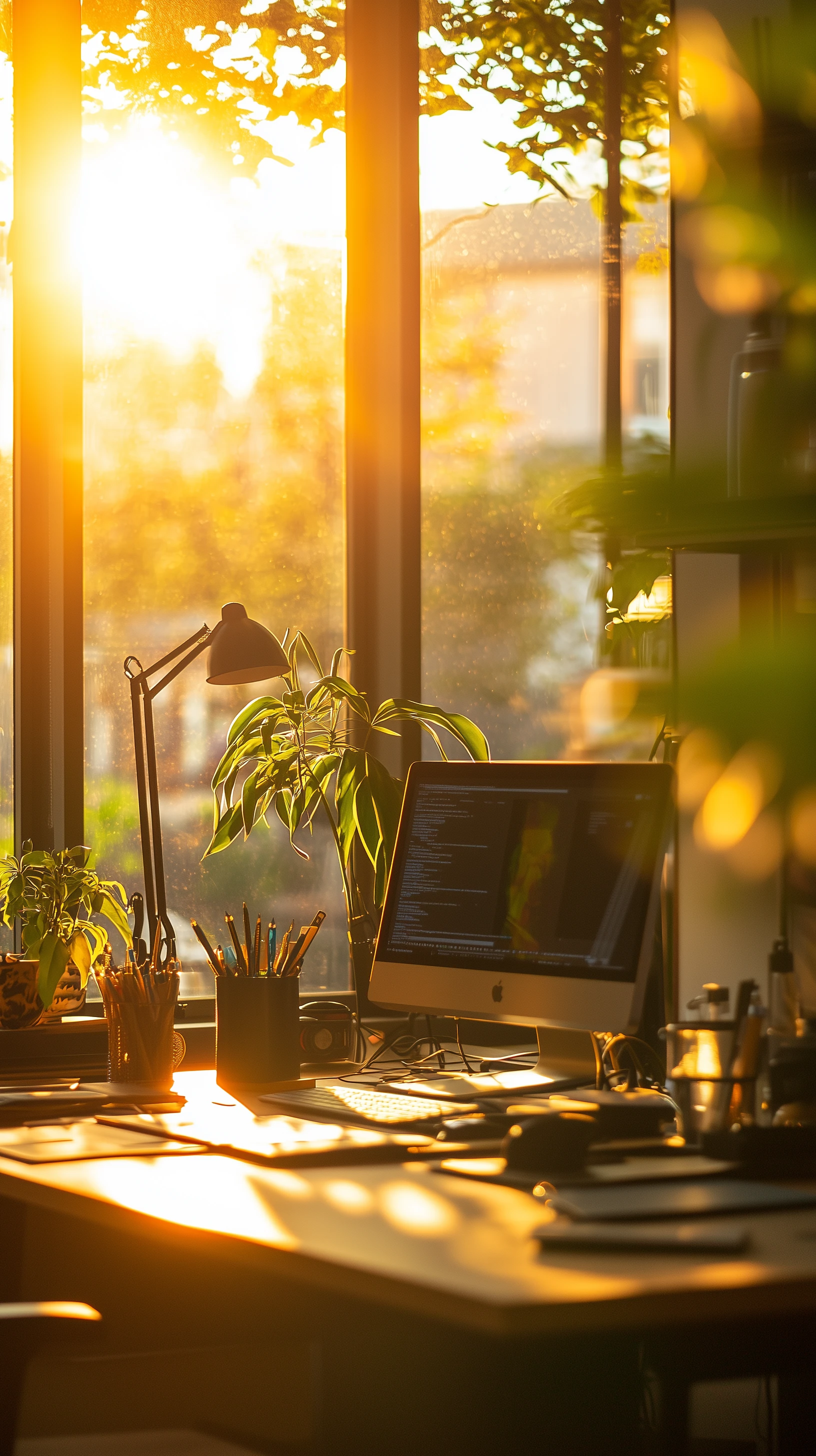 realistic photograph, lazy afternoon, sunlit at the co-working office desk, warm rays streaming in through large windows, dust motes illuminated in the air, shot with a Leica SL2, 24-70mm f/2. 8, set to 1/250s f/5. 6, crisp details, gentle color grading --ar 9:16 --quality 2 --style raw