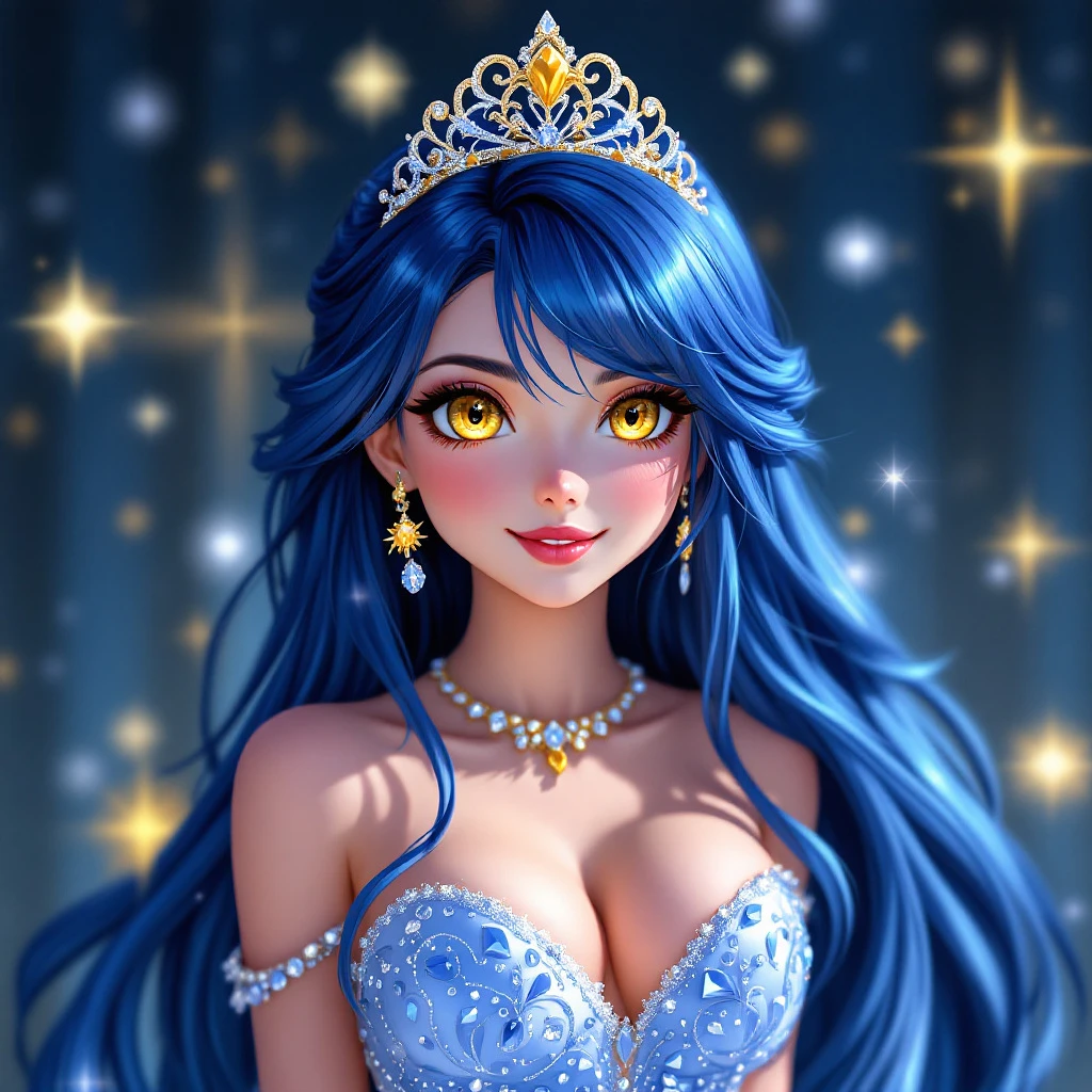 Anime Princess , long blue hair, yellow eyes, Tiara, rhinestone gown.