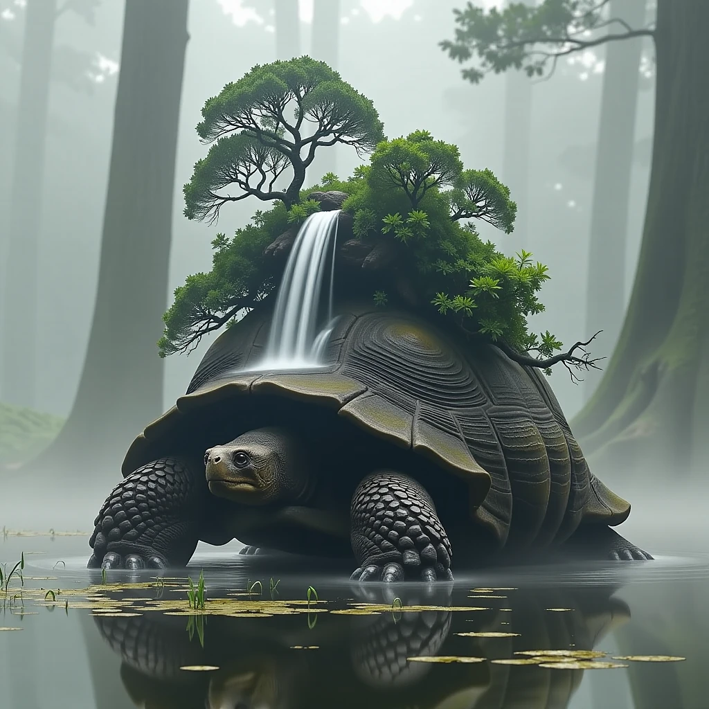 An ancient, colossal tortoise with a thriving forest ecosystem and waterfall on its back trudges through a misty swamp. ​​​