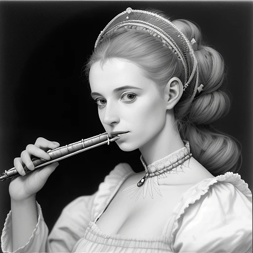 photo d’une femme qui joue de la flute traversière , aux cheveux longs et volumineux ondulés, le regard séduisant fixé sur l’appareil photo. Elle porte un chemisier dentelle très fine, déboutonné et noué à la taille, orné de broderies colorées rouge le long du revers jupe en jean foncé et déchiré. Son maquillage est doux avec des yeux souligné et des lèvres douces. La position de la femme est légèrement inclinée vers l avant, Le décor est à extérieur avec une toile de fond une foret brumeuse et humide