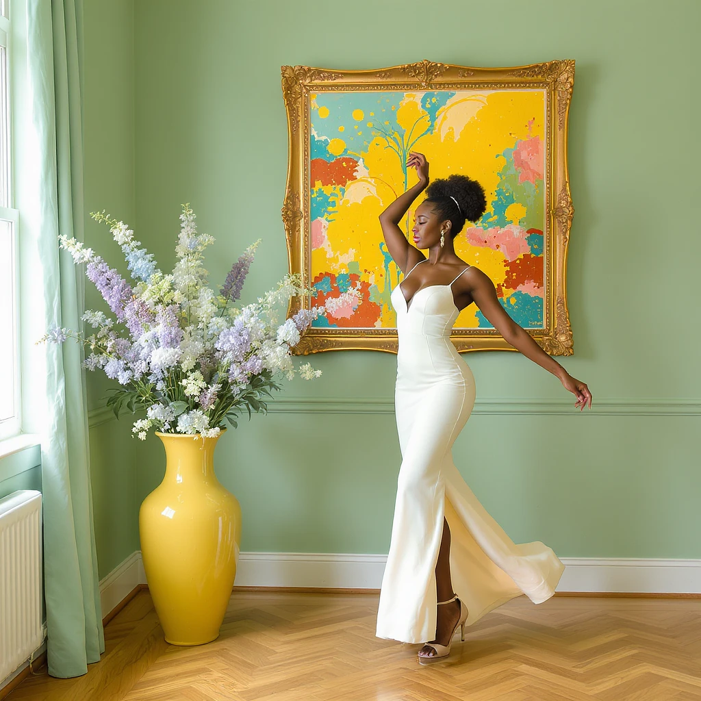 framed in ornate gold on all 4 sides, A splash of bright colors in a room painted with pale green with a large vase in pale yellow sitting in the corner with light lavander flowers and light blue flowers and a beautifully dressed African American lady in similar pale colors dancing around in high heels