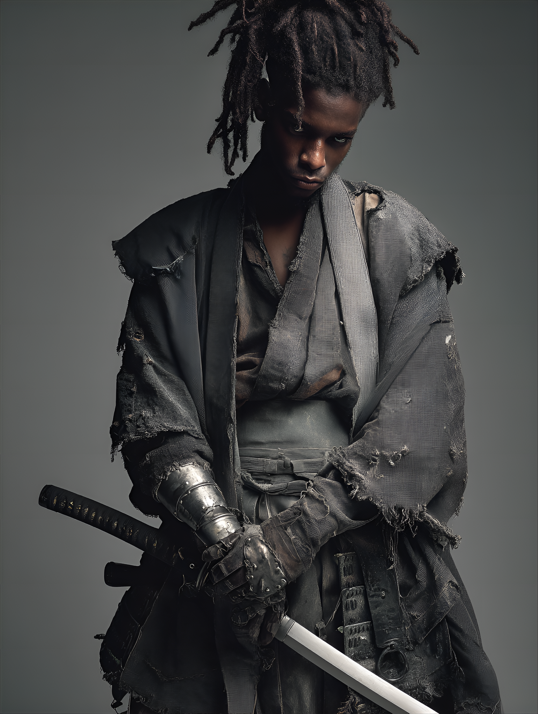 Dark-skinned male figure, young adult, with dreadlocks, in a distressed, worn, dark-gray/denim-style kimono-like garment. Heavy, torn textures, and fabric damage, creating a rugged, almost battle-worn appearance. The clothing has large, raw, exposed seams. Metal-plated armor or accessories are visible on the arms and at the waist. Visible chainmail or metal attachments around the forearms and waist. The subject holds a large, matte-gray, antique-style katana-like weapon. The subject has a serious, pensive, and contemplative expression, with an intense gaze. Full-body shot, mid-section, front-facing, with a slightly downward angle perspective. Neutral gray backdrop