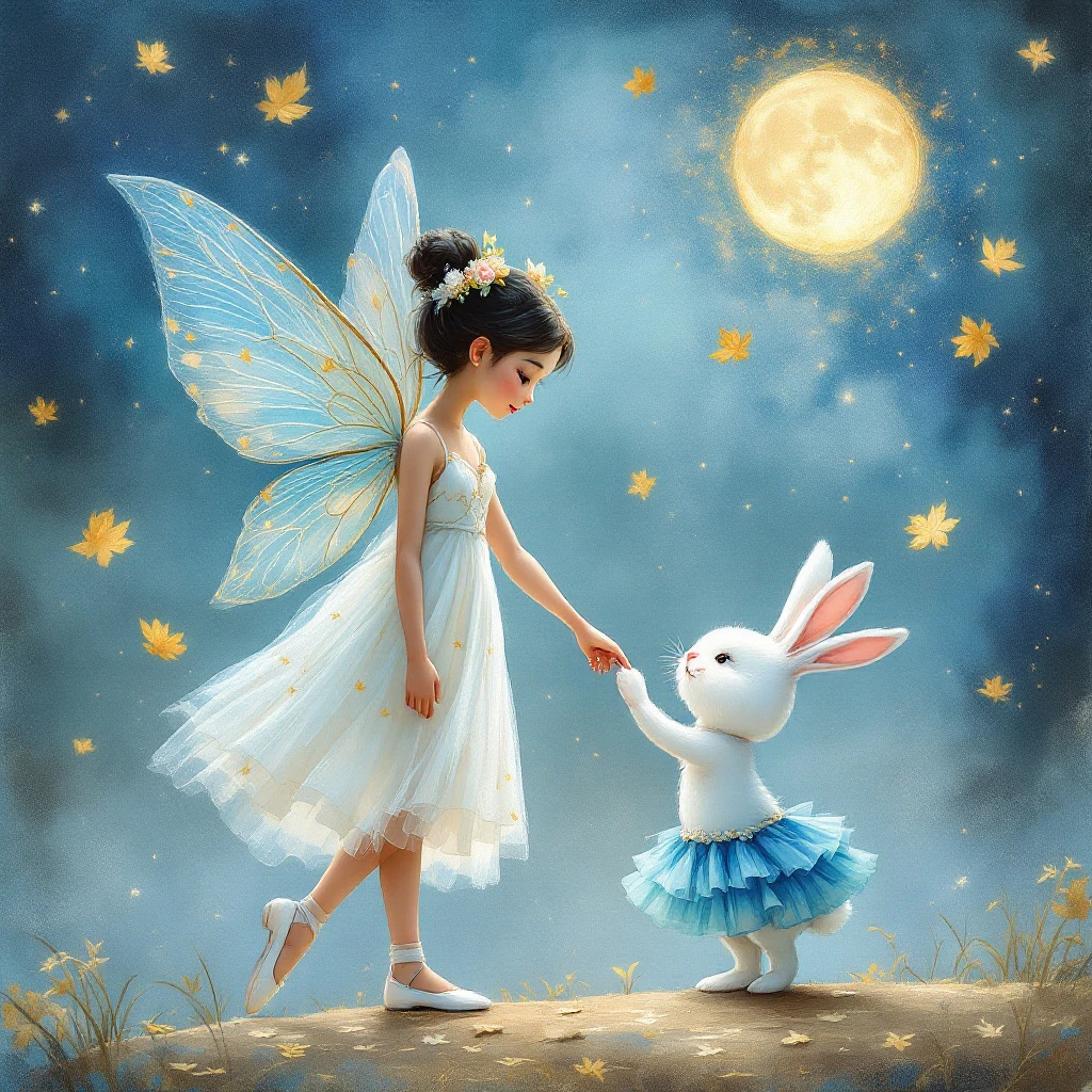 : A whimsical character depicting a fairy with delicate, translucent wings, wearing a flowing white dress and elegant ballet shoes. She is holding hands with an adorable white rabbit in blue tiered mini skirt or a cute, ruffled outfit. The rabbit stands on its hind legs, looking up at her. a vibrant swirling golden leaves flying in the air. This is adding a playful atmosphere. The fairy's dark blond hair is adorned with floral accent. Enchanting, magical, shimmering, a starry night sky, a glowing moon. a backdrop of abstract blues and silvers is slightly blurred. Richly textured brushstrokes, intricate patterns, vibrant colour palette, expressive forms, dynamic composition, dreamlike atmosphere, fusion of abstraction and realism, figures in motion, gold leaf accents, mild contrasts, swirling lines, hidden symbolism, masterful blending of colours, avant-garde style, innovative use of light and shadow, by Gustav Klimt, Pierre Bonnard, Robert Delaunay, Pablo Picasso. Anatomically correct. Full body of the character and rabbit are in frame. . creativity, fantasy, artistic flair. soft lighting on both characters enhancing the scene.
