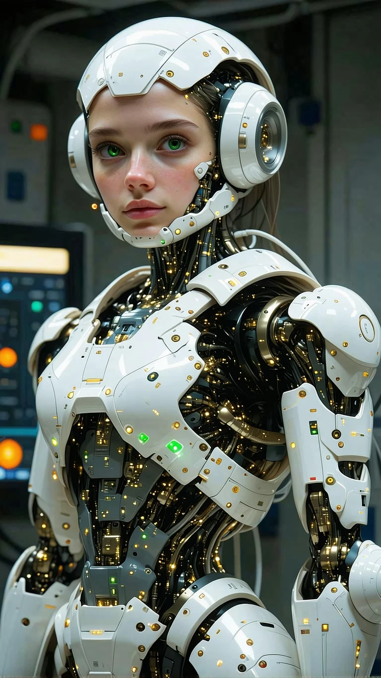 exceptionally beautiful tween girl, artificial intelligence robot, (futuristic) , (masterpiece) , (realistic) , (perfect anatomy) , (Full body) , pieced together armor , in a research lab, chest case open, showing all the wires, tubes, robotics inside, hooked to a computer, She shyly at the viewer, head tilted slightly to the side. She has green eyes, Perfect graphics, ultra-detailed, photo-realistic, full image view, full body view, front view, highly detailed, volumetric, dramatic lighting