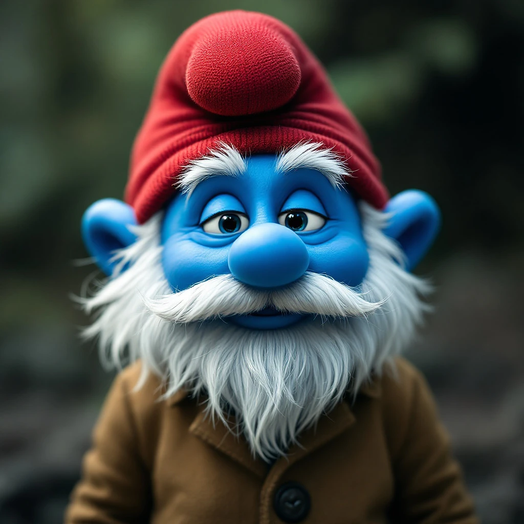 Photo of smurf with the face from father smurf, more hiperrealism, red hat, position front