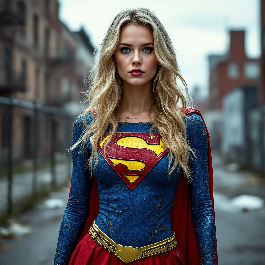 Image is a stylized, high-contrast photograph featuring a woman dressed in a tattered superhero costume resembling Supergirl. The costume is blue with a red and yellow 'S' logo on the chest, and a red skirt. The woman has long, wavy blonde hair and fair skin. She stands in an urban setting with a blurred background of buildings and a chain-link fence, suggesting a post-apocalyptic or battle scene. The overall tone of the image is gritty and intense, with a focus on the character's determined expression and the dramatic state of her attire.