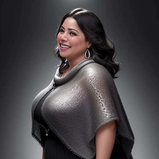 dark background, dramatic light, backlight, rim lighting, (chubby:0. 3) , mexican woman 44yo, laughing, look alike <well known actress> , from side, standing full body, poncho colorful , poncho translucent, silver jewelry, best quality, 4k, 8k, ultra highres, raw photo in hdr, sharp focus, intricate texture, skin imperfections, detailed eyes, glossy eyes, highlighted eyes
