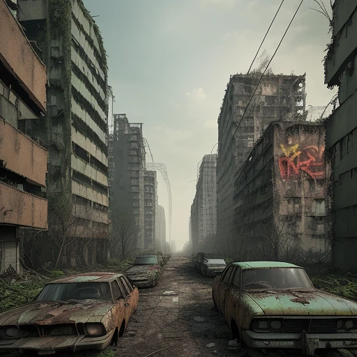 a photo of a post-apocalyptic city inspired by Pripyat, where crumbling skyscrapers and apartment blocks with broken windows and decaying facades rise above streets covered in dense vegetation. Rusted, graffiti-covered amusement parks, surrounded by silence, are overtaken by trees sprouting through the asphalt and vines climbing the structures. Rusted cars, empty playgrounds, and looted stores punctuate a desolate environment, while a constant fog and an air of abandonment permeate the city, creating a sense of desolation and mystery in a place that nature is slowly reclaiming