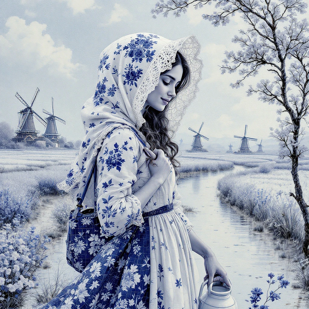 a drawing of a beautiful Dutch girl with a hint of a smile and a white "Frau Antje" hood made of Dutch lace; the girl is made of thousands of tiny "Delft Blue" ceramic tiles and is walking through a breathtakingly realistic landscape with windmills. She carries a milk jug in each hand. Delft-blue colors on natural white ground. elegant extremely detailed intricate 8k oil on canvas beautiful award winning high definition pencil sketch rich colours drawing with silver wire