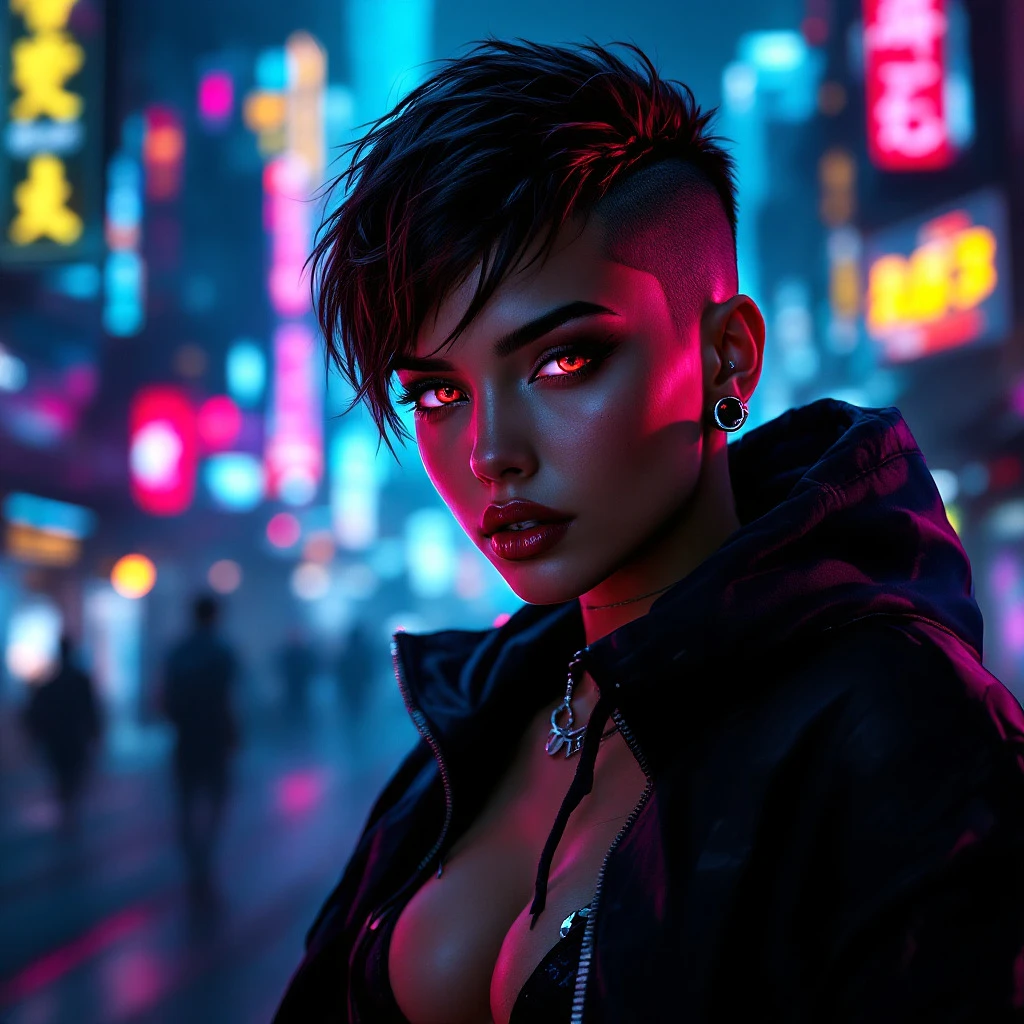 A Hyper-Realistic book cover of a beautiful cyberpunk Cuban female vampire hacker with golden tanned skin. 22 years old with short, cropped hair, deep maroon, pixie cut hair that is shaved on the sides. Her eyes are a sparkling ruby red. She is dressed in a cyberpunk style hoodie, combining shades of black, silver and blue neon details. In the background, an urban night scene with neon lights, holograms and a dystopian and technological atmosphere, realistic hyper-detailed portraits. --ar 73:128 Inspired by Judy Alvarez of Cyberpunk 2077 character, Judy Alvarez and film, Underworld. Perfect eyes. 8k. HD. She is looking at the viewer. Sultry lok on her face. perfect anatomy. Realistic eyes. She is looking at the viewer. Neo-Havana in the background. Perfect eyes. Epic fantasy.