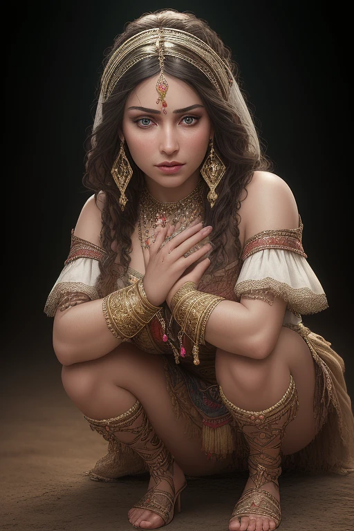 photorealistic, ultra highly intricate detailed, professional photo, beautiful woman dressed like a gypsy, (full-body) , (Crouching low with hands on the ground, ready for action or play) , portrait lighting, subpixel rendering, smooth vertex shading, (best quality, sharp focus, masterpiece, 4k, ultra detailed, sharp focus, 8k, high definition, insanely detailed, intricate:1.1) , bokeh, <lora:more_details:1> <lora:epi_noiseoffset2:1> <lora:epiCRealLife:1>