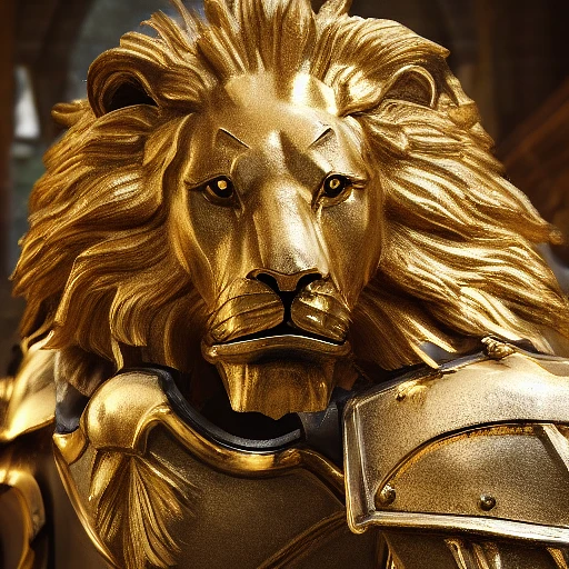 gold lion in lanister armor, in the background of the kingdom, dragonstone eyes, close-up, 8k ultra realistic, photorealistic, photography lighting, reflection mapping, ultra detailed, photorealistic, cinematic, --ar 4:5 --q 2