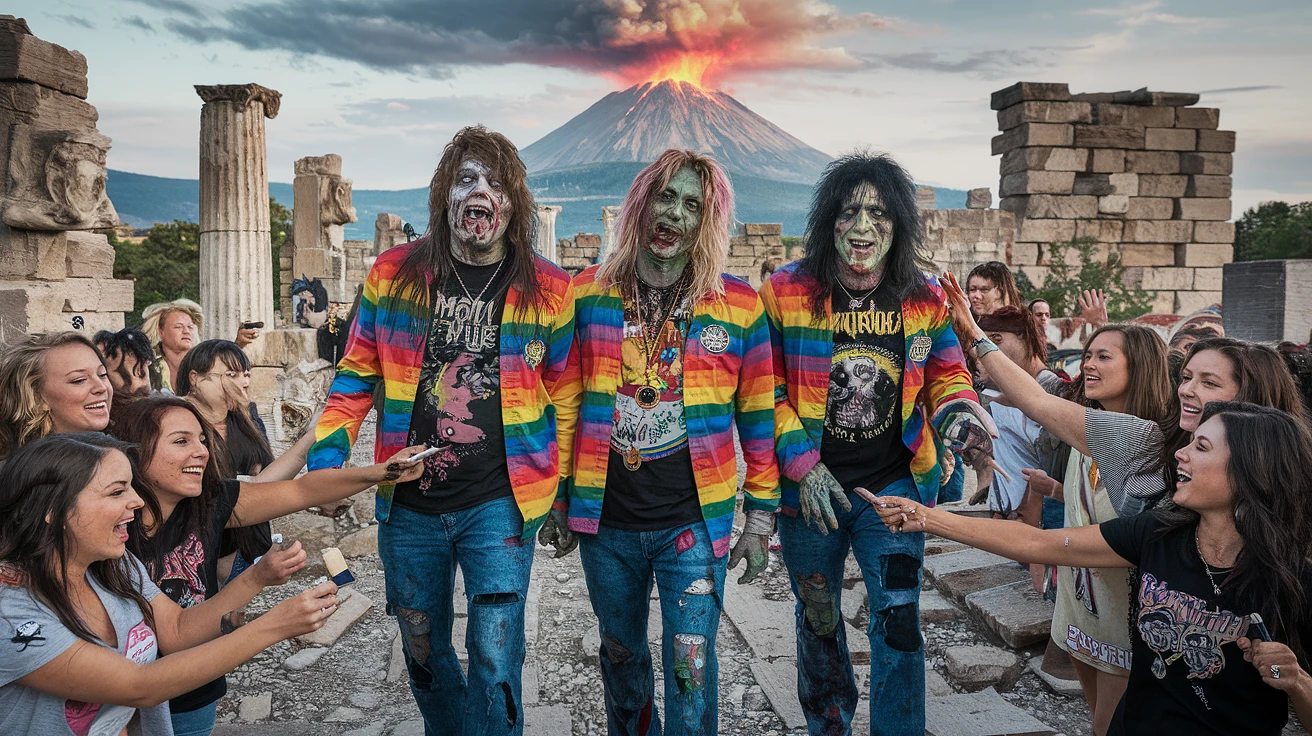 64K, UHD Photorealistic Horror Photo of the heavy metal band Motley Crue as zombies wearing rainbow colored clothes walking through the ruins of an ancient city destroyed by a volcano. there are many 20 year old women wearing band tee-shirts who are fans trying to get their autographs.