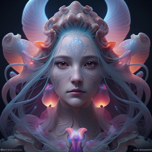 Goddess close-up portrait ribcagel. jellyfish phoenix head, nautilus, orchid, skull, betta fish, bioluminiscent creatures, intricate artwork . octane render, trending on artstation, t symmetrical artwork. cinematic, hyper realism, high detail, octane render, 8k