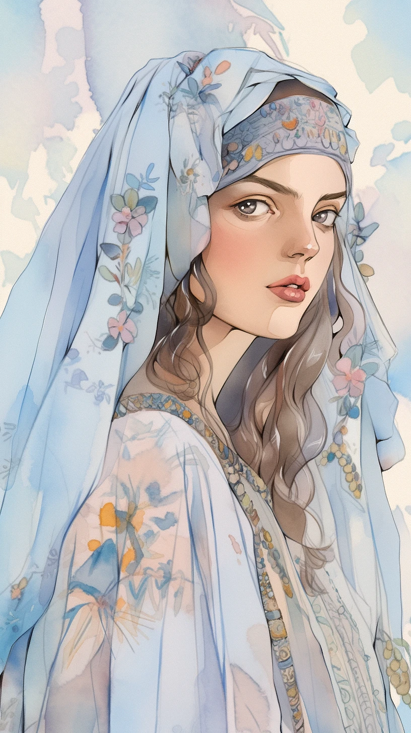 The Renaissance meets watercolor, close up shot of Italian classical girl, manga style, in flowy ethereal warrior garment, Kelly Sue Deconnick-inspired by Brandon Mably combined with Fashion photography, pastel palette, soft blue background painted --niji 5 --q 2 --v 5. 1 --ar 9:16