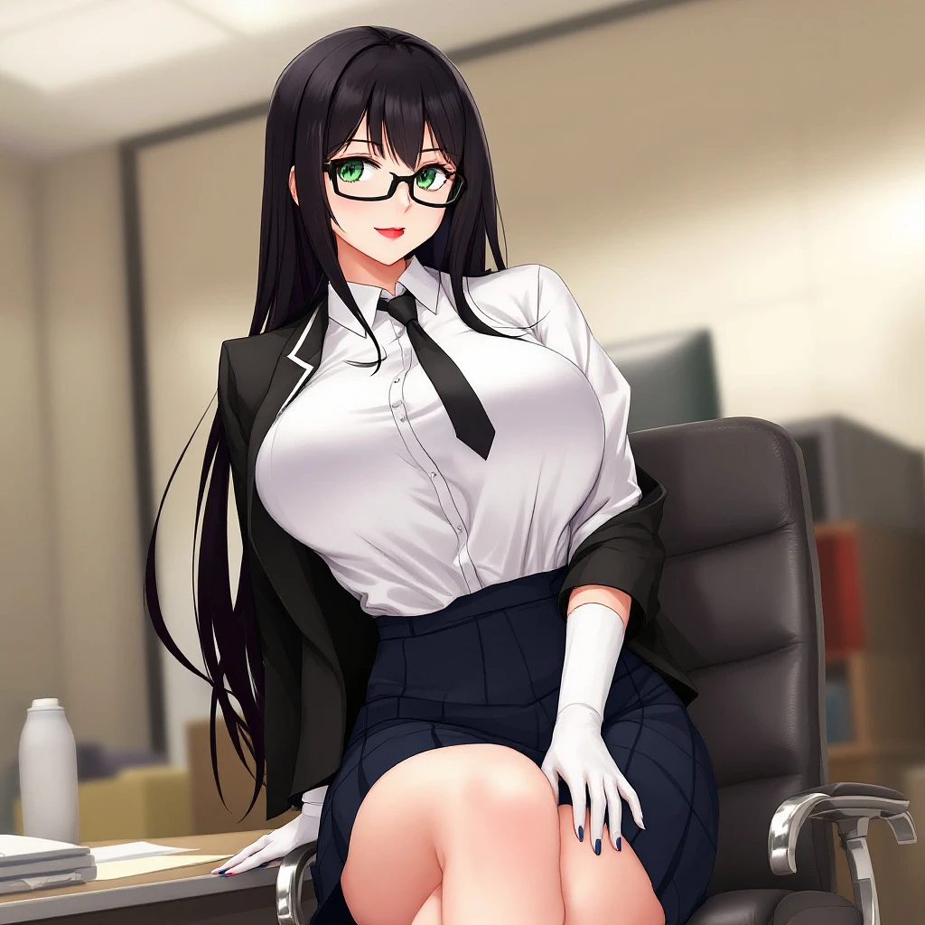 anime, woman, black hair, long hair, green eyes, black glasses, red lips, white shirt, black tie, black blazers, short dark blue skirt, highschool skirt, white socks, black shoes, standing at an office, big chest, sitting on a chair, sitting with legs crossed