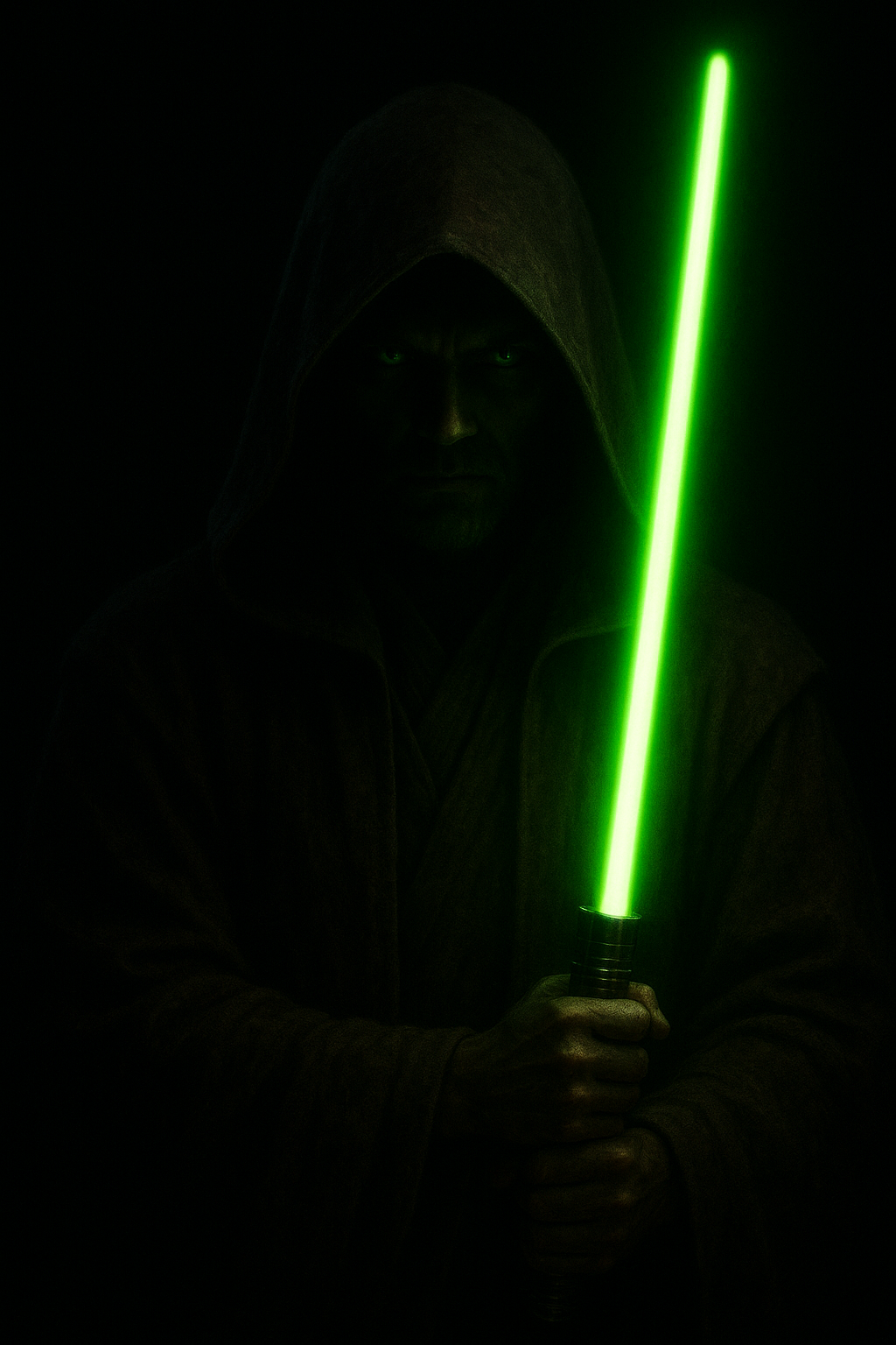 Une illustration cinématique et artistique, montrant uniquement le buste d’un chevalier Jedi. Le personnage est enveloppé dans la robe de bure traditionnelle des Jedi, avec le capuchon rabattu sur sa tête, créant une profonde obscurité qui cache la majeure partie de son visage. Dans cette ombre, seuls ses yeux percent, d’un vert intense et lumineux, fixant avec une intensité captivante. Le chevalier Jedi tient son sabre laser à deux mains, la lame d’énergie verte étant parfaitement parallèle à son corps. La lueur de la lame diffuse un éclat verdâtre réaliste et puissant qui éclaire subtilement une partie du visage, des mains et du tissu de la robe, créant un contraste fort entre la lumière et l’ombre. Le style doit être cinématique, dramatique et artistique, avec un rendu hyperréaliste, des détails fins sur les textures du tissu et la lumière. Le fond est totalement noir, uni, sans aucun élément, accentuant l’effet mystérieux et la puissance visuelle du personnage. Atmosphère sombre, solennelle et épique.