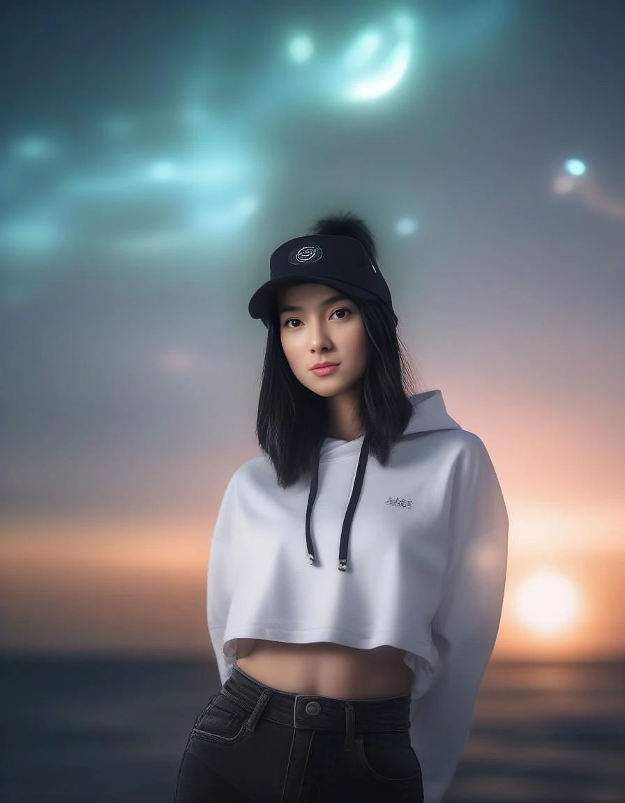 dreamscape beautiful young, thin, fit, short messy hair, intrincate details, baggy pants, t-shirt, (crop hoodie) , goggles, cap, midriff, bellybutton piercing, Fashion Pose, DSLR, F/2. 8, Lens Flare, 5D, 16k, Super-Resolution, . surreal, ethereal, dreamy, mysterious, fantasy, highly detailed