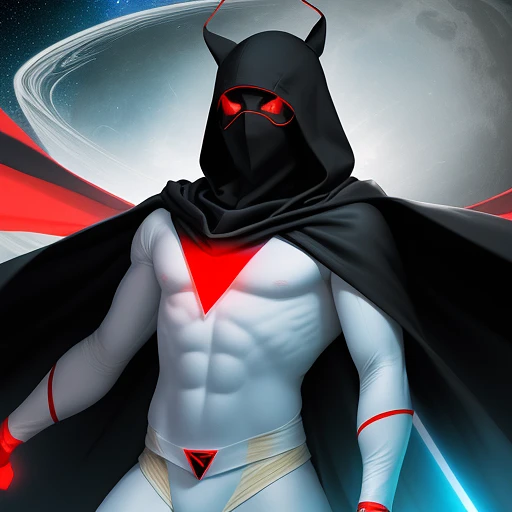 We are seeing a six feet tall, superhero, in a black hooded type cowl mask, with no ear, in white tights, with a red triangle on his chest, has two red bracelets on each hand, a yellow cape with glowing white eyes . . . fly through spaces like a hyper spaceship, cover in a light blue cosmic glow.
