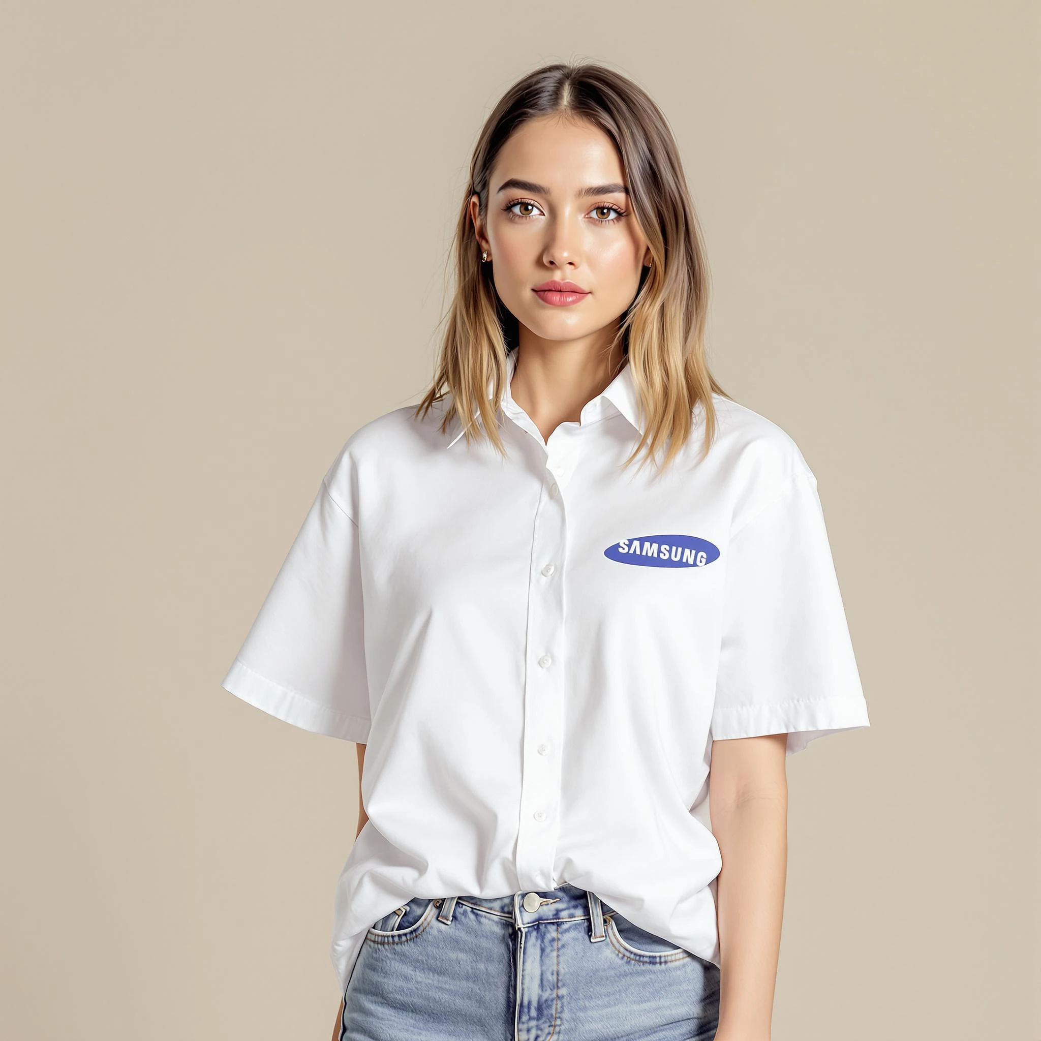 A young woman with shoulder-length hair stands confidently in front of a neutral background, wearing a simple, crisp white shirt. The shirt prominently displays a Samsung logo on the left side, adding a modern and subtle brand touch. She strikes a dynamic pose, with one hand on her hip and the other casually placed by her side. Her expression is confident yet approachable, exuding a cool and casual vibe. The lighting highlights her features, casting soft shadows that enhance the natural tones of her skin. The background is minimalistic, ensuring that the focus stays on her and the shirt, creating a clean and fresh aesthetic. Her jeans are simple and stylish, completing the laid-back yet fashionable look