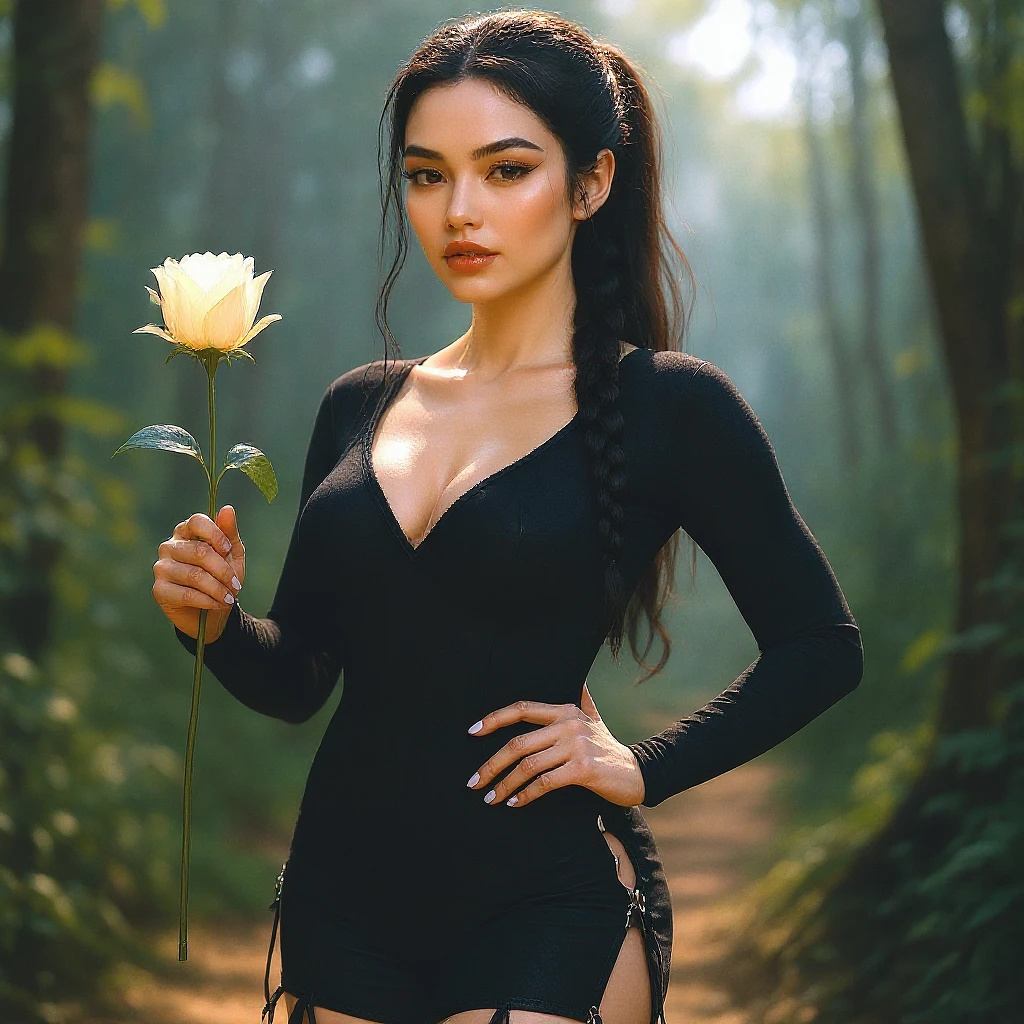 Beautiful . Ponytail hair. Voluptuous curvaceous tall woman. Objectively beautiful. Exotically Entrancing. More beautiful than any final fantasy character. Real life. Long slender legs. Tall. Thick thighs. Real life woman. Super Realistic. High Quality Image. Highly detailed beauty. Exotic. Wondrous. Very Busty. . . Wearing v neck shirt. Slim waist. Hour glass body. Wearing pants with exposed sides. Skinny Face. Upscaled image.
